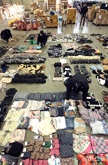 【NEWSIS】釜山税関の職員が9日、釜山市江西区の釜山税関新港指定蔵置場で、流通業者から押収した中国製偽ブランド品を整理している様子。