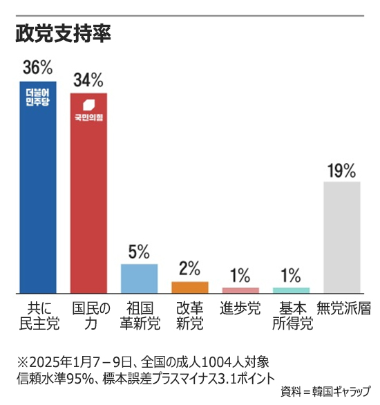 韓国ギャラップの調査で尹錫悦(ユン・ソンニョル)大統領の弾劾賛成が64%、反対は32%だった。政党支持率は野党・共に民主党が36%、与党・国民の力が34%とその差は誤差の範囲(プラスマイナス3.1ポイント)内だった。
