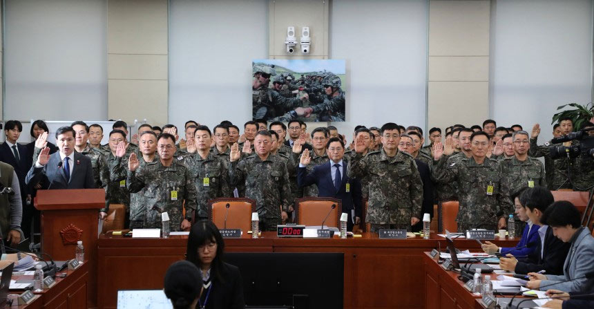 ▲14日午前、ソウル・汝矣島の国会で開かれた「尹錫悦(ユン・ソンニョル)政権の非常戒厳宣布による内乱容疑真相究明国政調査特別委員会」で、国防長官職務代行の金善鎬(キム・ソンホ)国防次官をはじめとする出席者たちが証人宣誓をする様子。写真=ナム・ガンホ記者