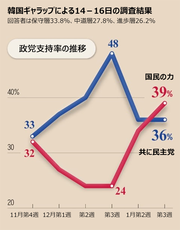 国民の力が前週に比べて5ポイント(34%→39%)上がった反面、共に民主党は先週と同じだった。韓国ギャラップは「今月に入って二大政党は『昨年12月3日の非常戒厳宣布』以前の拮抗(きっこう)した構図に戻った」と分析している。