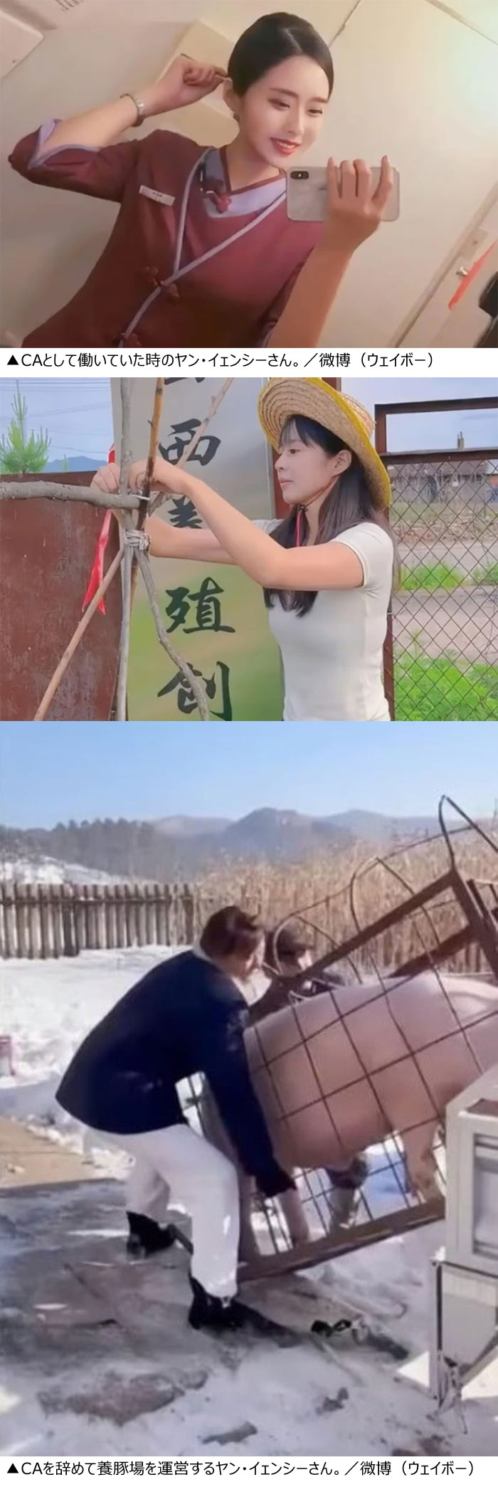 香港紙サウスチャイナ・モーニング・ポストが22日(現地時間)、報じた。それによると、中国東北部・黒竜江省の田舎の農家に生まれたヤン・イェンシーさん(27)は、大学卒業後、上海の航空会社で5年間にわたり客室乗務員(CA)として働いたが、2023年からは故郷で養豚場を運営している。