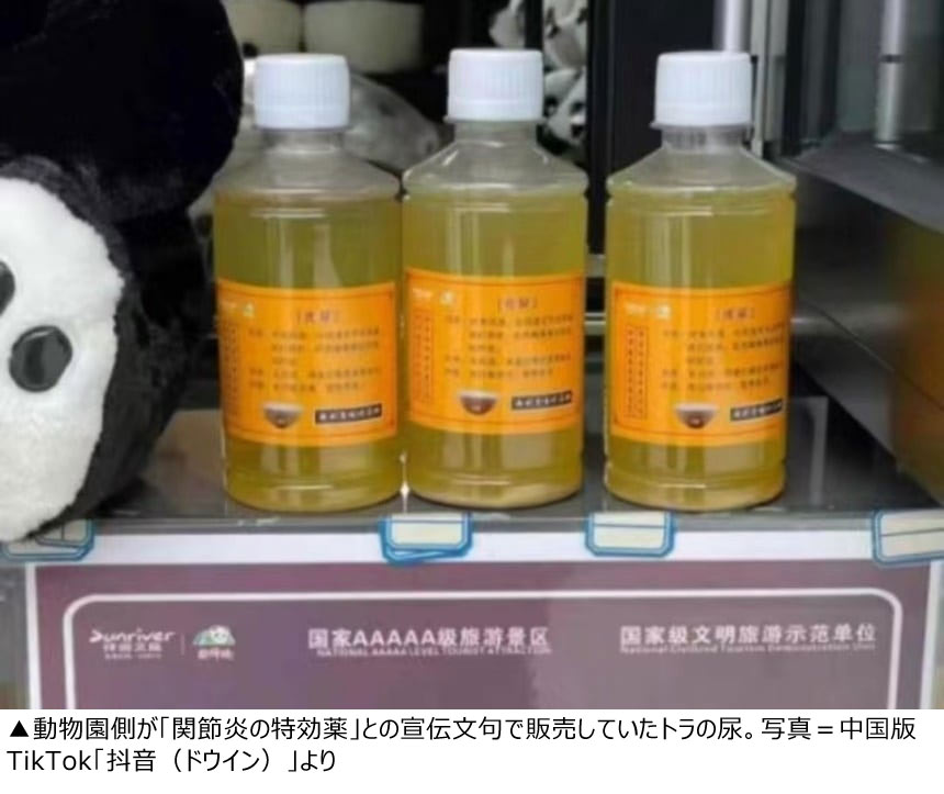 中国のインターネット・メディア澎湃新聞などが24日(現地時間)に報道したところによると、中国四川省雅安市碧峰峡のある動物園ではこのほど、トラの尿を1本50元(約1100円)で販売したとのことだ。動物園ではトラの尿を「関節炎の特効薬」だと宣伝したほか、「リウマチ性関節炎による痛み、打撲傷、筋肉痛などに効果がある」との紹介文まで掲げていたという。