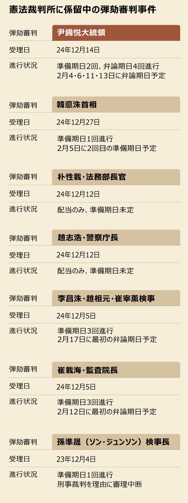 憲法裁判所には韓悳洙(ハン・ドクス)元大統領権限代行、崔載海(チェ・ジェヘ)監査院長、野党・共に民主党の李在明(イ・ジェミョン)代表防弾目的の検事3人など、弾劾審判事件だけで9件が係留されている。これらの事件は正式な弁論が始まってもいないか、まだ始まったばかりの段階だ。法律に詳しい専門家の間からは「憲法裁判所は世論に流され尹大統領事件だけを拙速に審理する恐れがある」などの指摘も相次いでいる。