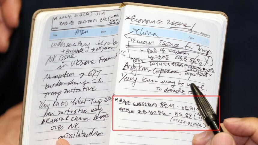 ▲「トランプ ノーベル平和賞 推薦書-ノルウェー委員会に提出 受付完了-米側通報(ホワイトハウス報告予定)」と書かれている手帳。写真=NEWSIS