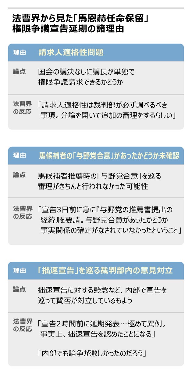 韓国法曹界からも、憲法裁がこの事件を急いで審理する中で「請求人適格性」問題を手抜きし、「与野党合意」など中心的な争点をきちんと取り上げなかったことから、宣告が延期されたのだろう-という分析が出ている。
