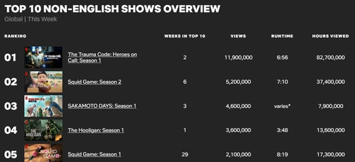このほか「イカゲーム」シーズン1が5位、恋愛バラエティー「脱出おひとり島」シーズン4が6位に入り、テレビ非英語部門の上位10作品のうち4作品を韓国コンテンツが占めた。