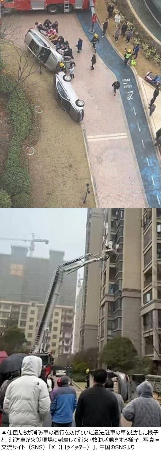 中国で、マンションの火災現場に向かっていた消防車が、違法駐車の車のせいで通行を阻まれるや、住民たちが集まって車をどかすという出来事が発生した。