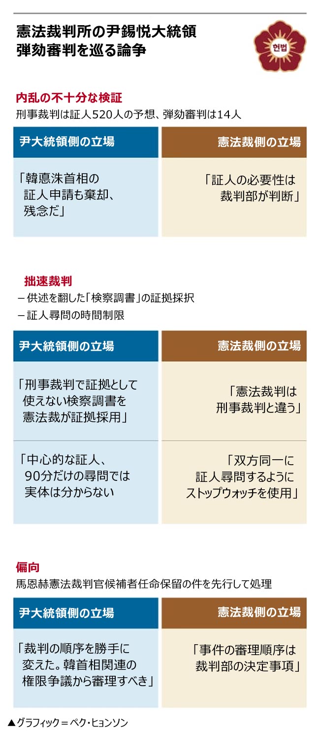 これについて法曹界からは「戒厳宣布が内乱罪に該当するかどうかは大統領弾劾訴追の核心事由の一つなのに、憲法裁では究明されたものはなく、中心的な証人が証言をひっくり返したことでむしろ疑問ばかりが大きくなった」という批判が出た。ある法曹関係者は「内乱疑惑の究明どころか、手続き的な欠陥と政治偏向の論争の中でも、憲法裁は『2月末-3月初めの宣告』を目標に走っている様子」と語った。