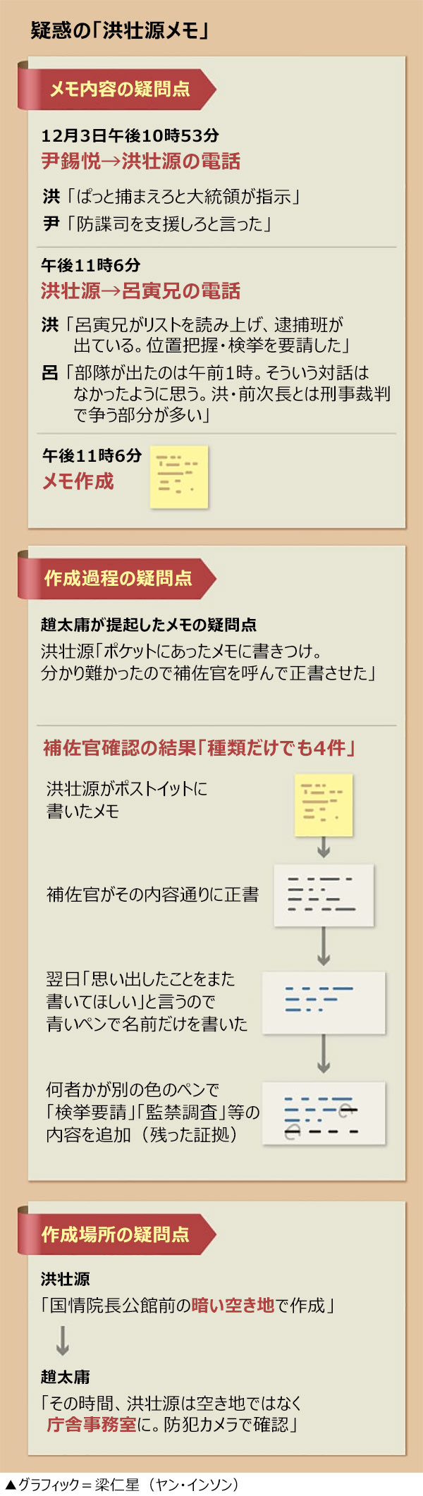 政治家逮捕指示があったかどうかは大統領弾劾審判の争点だ。「洪壮源メモ」は主要な証拠の一つとして提示され、メモの内容が公開されたことで国会の大統領弾劾訴追可決はスピードアップした。13日に洪・前次長は、院長公館と執務室は近いとして「特定の時間ではなく全体の動線を見るべき」と言った。だが戒厳令直後に逮捕リストという重大な情報を書き取ったとする人物が、場所と時間を完全に間違えるというのは異常だ。メモの内容そのものについても疑いは避けられない。洪・前次長のメモの真偽を明らかにすべきだ。
