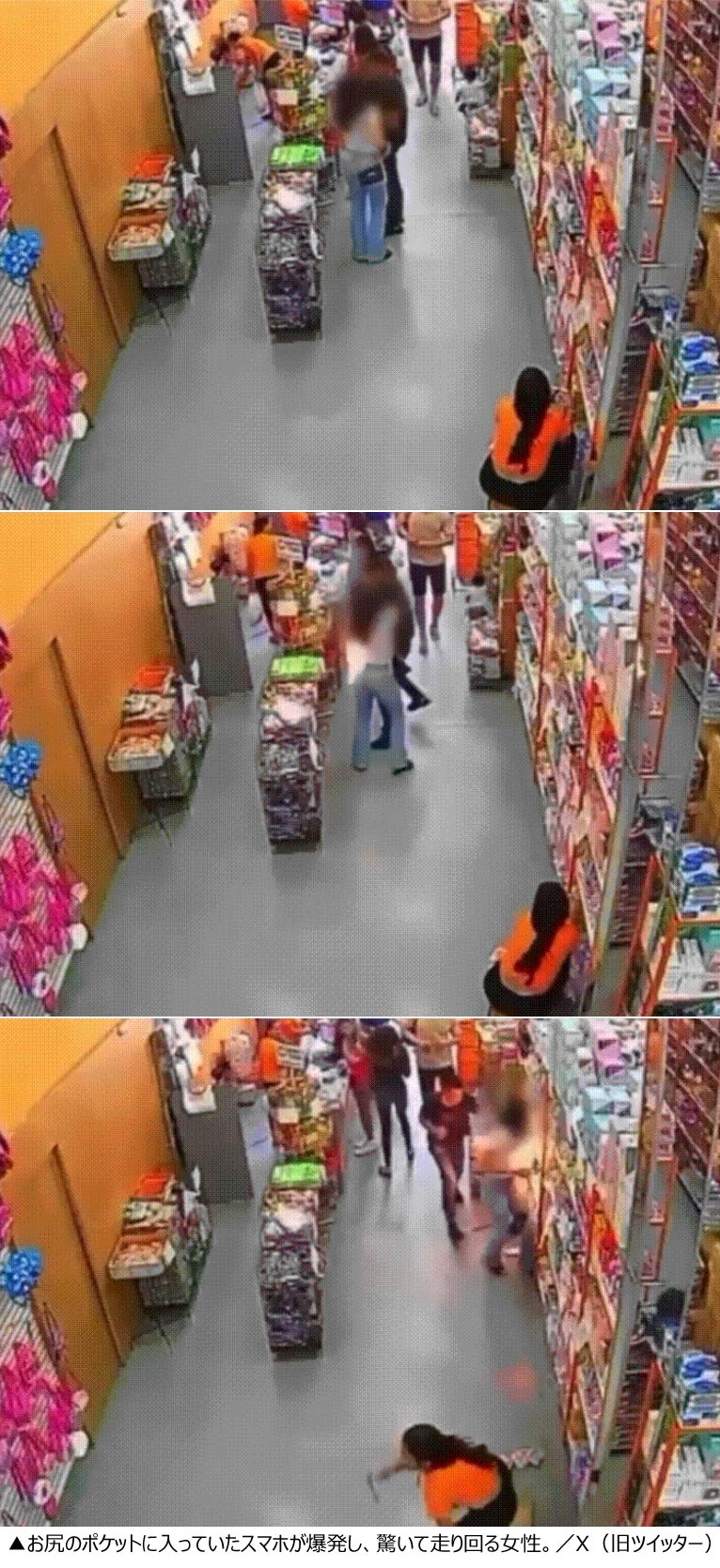 当時の状況が映った防犯カメラの映像を見ると、陳列台を見ながら立っていた女性の左側のお尻のポケットから火花が飛び、爆発が起きる。そのままお尻から炎が上がって女性は驚き、店内を駆け回りながら防犯カメラのアングルの外に消えていく。