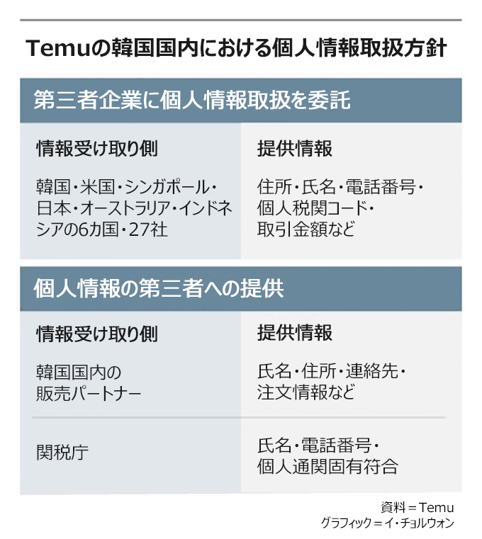 Temuは個人情報取扱方針に「個人情報保護法に基づき個人情報を移転する」と書いている。だが、韓国個人情報保護委員会は、Temuの個人情報取扱手続きが適法かどうかを調査している。同委員会関係者は「個人情報の国外移転や第三者提供そのものに問題があるとは言えない」としながらも、「個人情報取扱を委託する場合、きちんと告知をしているのか、個人情報を第三者に提供する際に同意を得ているのか、告知したこと以外に追加でさらに多くの情報を提供することがあるのか、などを調べている」と語った。