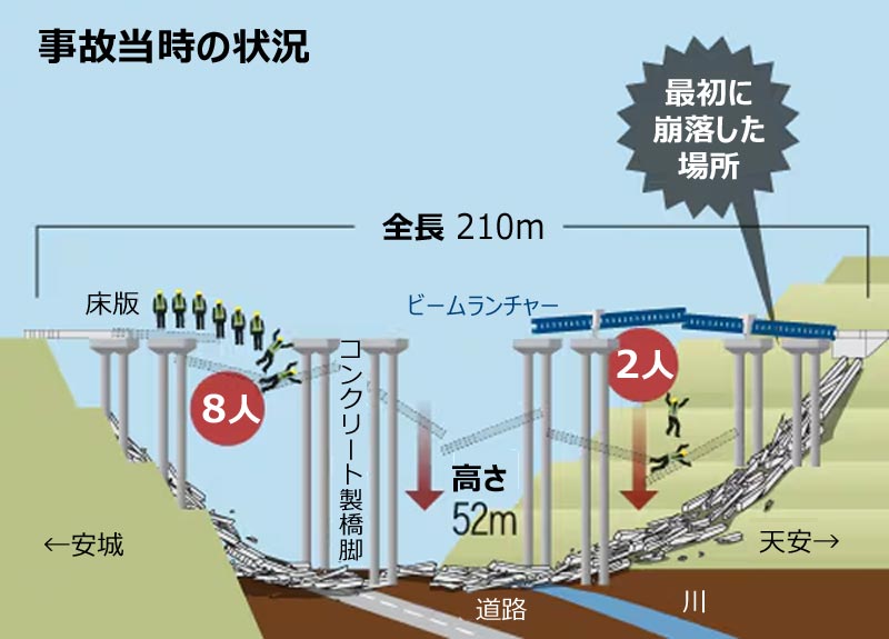 今回の事故で作業員4人が死亡し、6人が負傷した。最も高いところで高さ52メートルという構造物の上から転落したが、1人は軽傷で、顔にけがをしたという。この作業員は最初に崩れた構造物の上にいたことが分かった。消防関係者は「最初に崩れた構造物は山の斜面の上にあり、高さが約15メートルだった」と語った。