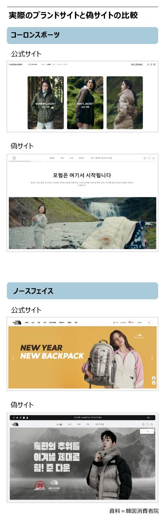 偽サイトは、インスタグラムなどSNS(交流サイト)の広告で消費者を呼び込み、公式サイトにそっくりなURL(アドレス)を使って消費者をだましていた。URLだけでなく、公式名称やロゴ、商品紹介、事業者情報なども実際のブランドのものをそのまま使って消費者の目を欺いていた。消費者院が公開した偽サイトを見ると、ブランドのモデルが出ているポスターの画像などをそのまま使用しており、一見したところ公式サイトのようだ。ところが偽サイトは、在庫一掃などと書いて90%以上の割引率を表示し、消費者を誘惑する。定価99万ウォン(約10万3300円)のダウンジャケットを9万9000ウォン(約1万300円)で販売するといった具合だ。