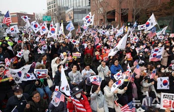 【NEWSIS】ソウル中央地裁が尹錫悦(ユン・ソンニョル)大統領の拘束取り消し請求を認めた7日午後、ソウル市竜山区の大統領官邸前でデモを開く支持者たち。