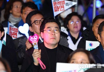 【NEWSIS】10日午後、ソウル市鍾路区の景福宮前で、「尹錫悦(ユン・ソンニョル)即時退陣・社会大改革非常行動」主催による尹大統領弾劾要求デモが行われた。写真はデモに参加してシュプレヒコールを上げる最大野党・共に民主党の朴賛大(パク・チャンデ)院内代表。