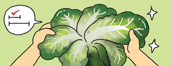 春白菜は外葉が濃い緑色で、つやがあるものが新鮮でおいしい。白い茎の部分が短く、手で持ったときに重みがあるものを選ぼう。