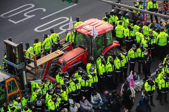 この日のデモは突然始まった。発端は前日に韓国の全国農民会総連盟(全農)が起こした「トラクター上京デモ」だ。全農は25日、ソウル市瑞草区の南泰嶺坂に、貨物トラック25台にトラクター30台を載せて集結した。警察は1トントラック20台以外のソウル進入を阻止するという裁判所の決定に基づき、バスでバリケードを築いてトラクターがソウル中心部に入れないようにした。