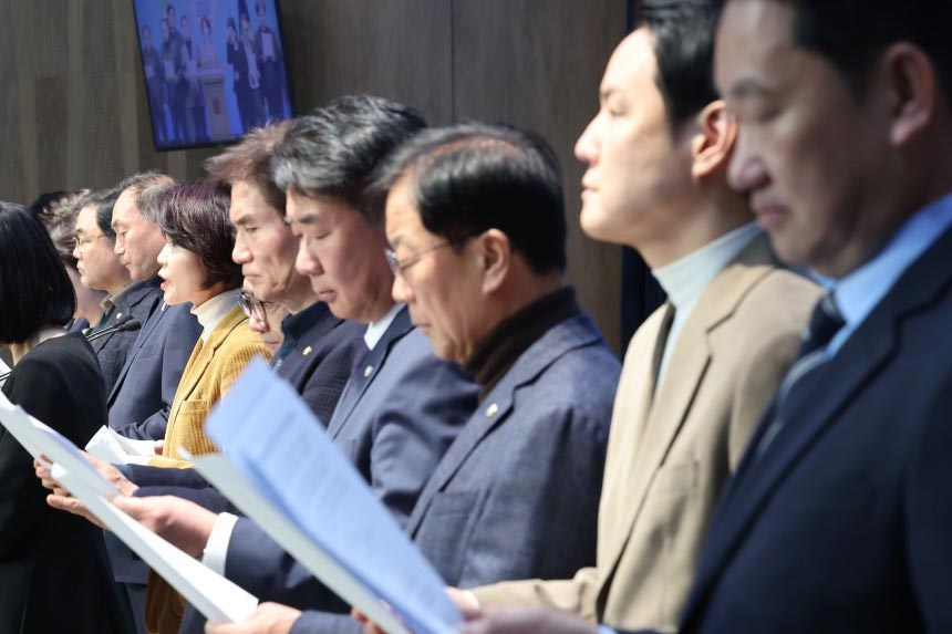 ▲国会外交統一委員会、産業通商資源中小ベンチャー企業委員会、情報委員会に所属する野党・共に民主党の複数の議員らは18日午後、ソウル汝矣島の国会で米エネルギー省が韓国をセンシティブ国に指定した問題を巡り会見を開いた。/NEWSIS