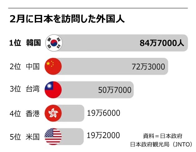 2月、訪日外国人の1位は韓国、次いで中国、台湾、香港、米国の順