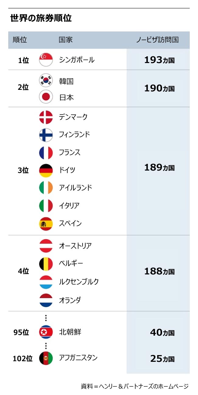 日本のパスポート・パワーは世界最上位クラスだ。ビザなしで入国できる国が190カ国に上っている。国際法律会社「ヘンリー&パートナーズ」と国際航空運送協会(IATA)は毎年、全世界199カ国のノービザ協定締結現況を分析し、その国のパスポート・パワーを示す「ヘンリー・パスポート・インデックス」を発表している。今年3月、ヘンリー・パスポート・インデックスで1位となったのは193カ国とノービザ協定を締結し..
