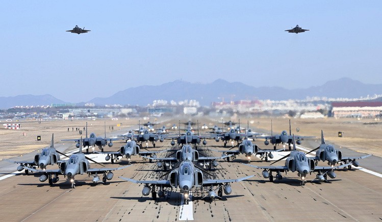 ▲昨年、韓国空軍第10戦闘飛行団が駐留している水原空軍基地で、韓米合同軍事演習「自由の盾(フリーダムシールド=FS)」の訓練を行う約30機の戦闘機。写真提供=韓国空軍