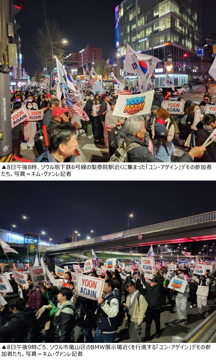 だが同日、保守系団体が届け出たデモはもう一つあった。「自由大学」という団体がソウル地下鉄6号線の梨泰院駅近くで午後8時に「ユン・アゲイン」というデモを行ったのだ。このデモには約1000人が集まり、「ユン・アゲイン」「反国家勢力追放」「もう一度、もう一度」とシュプレヒコールを上げながら大統領公邸近くまで行進した。デモ参加者たちは太極旗(韓国国旗)と星条旗(米国国旗)を振り、「YOON AGAIN」「不正選挙を糾明しないままの早期大統領選挙を拒否する」などと書かれたプラカードを手にしていた。