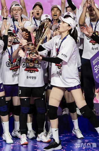 【NEWSIS】8日、仁川市内の仁川三山ワールド体育館で、2024-25韓国プロバレーボール「Vリーグ」女子チャンピオン決定戦の第5戦、仁川興国生命ピンクスパイダーズと大田正官庄レッドスパークスの試合が行われた。写真はこの試合に勝って統合優勝を果たし、優勝トロフィーを手にする興国生命の金軟景(キム・ヨンギョン)。金軟景はこの試合を最後に現役を引退した。