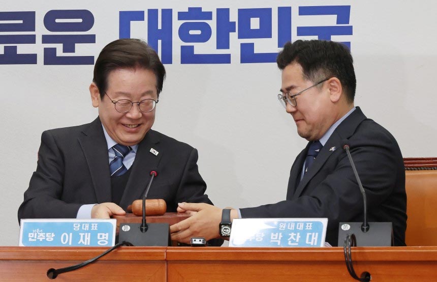 ▲共に民主党の李在明・前代表が4月9日、国会で開かれた最高委員会議で党代表職辞任の意向を表明した後、朴賛大(パク・チャンデ)院内代表に議事棒を渡す様子。/写真=ナム・ガンホ記者