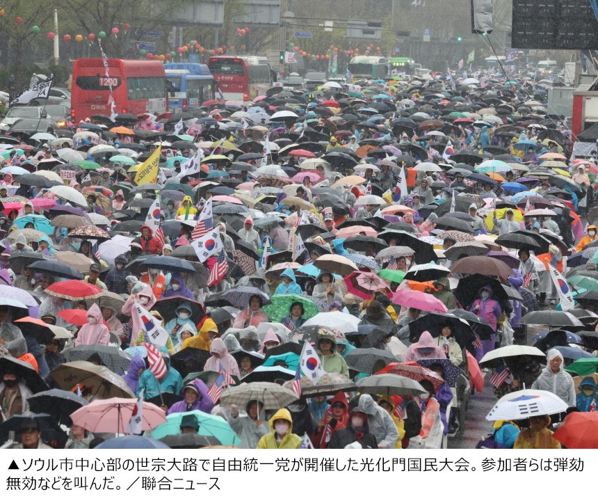 【写真】季節外れの雪が降る光化門広場で弾劾無効を訴える市民たち(4月12日撮影)