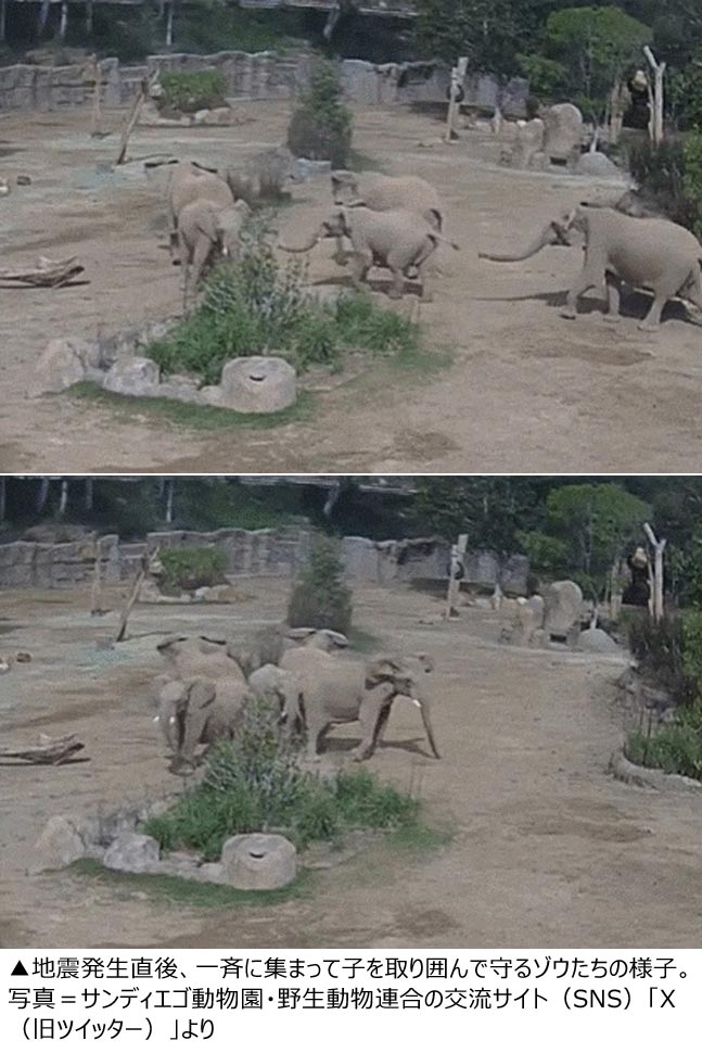 米カリフォルニア州サンディエゴ近くでマグニチュード(M)5.2の地震が発生した時、動物園のゾウたちが一斉に集まって子ゾウを守る貴重な映像がカメラに捉えられた。