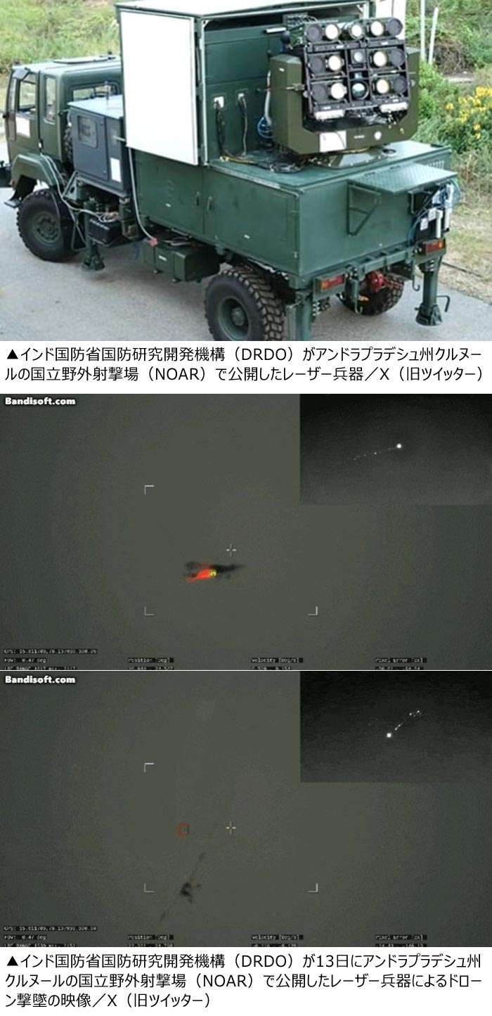 16日付の英紙「テレグラフ」報道によると、インド国防省国防研究開発機構(DRDO)は今月13日、アンドラプラデシュ州クルヌールの国立野外射撃場(NOAR)で新たに開発したレーザー兵器を公開したとい..