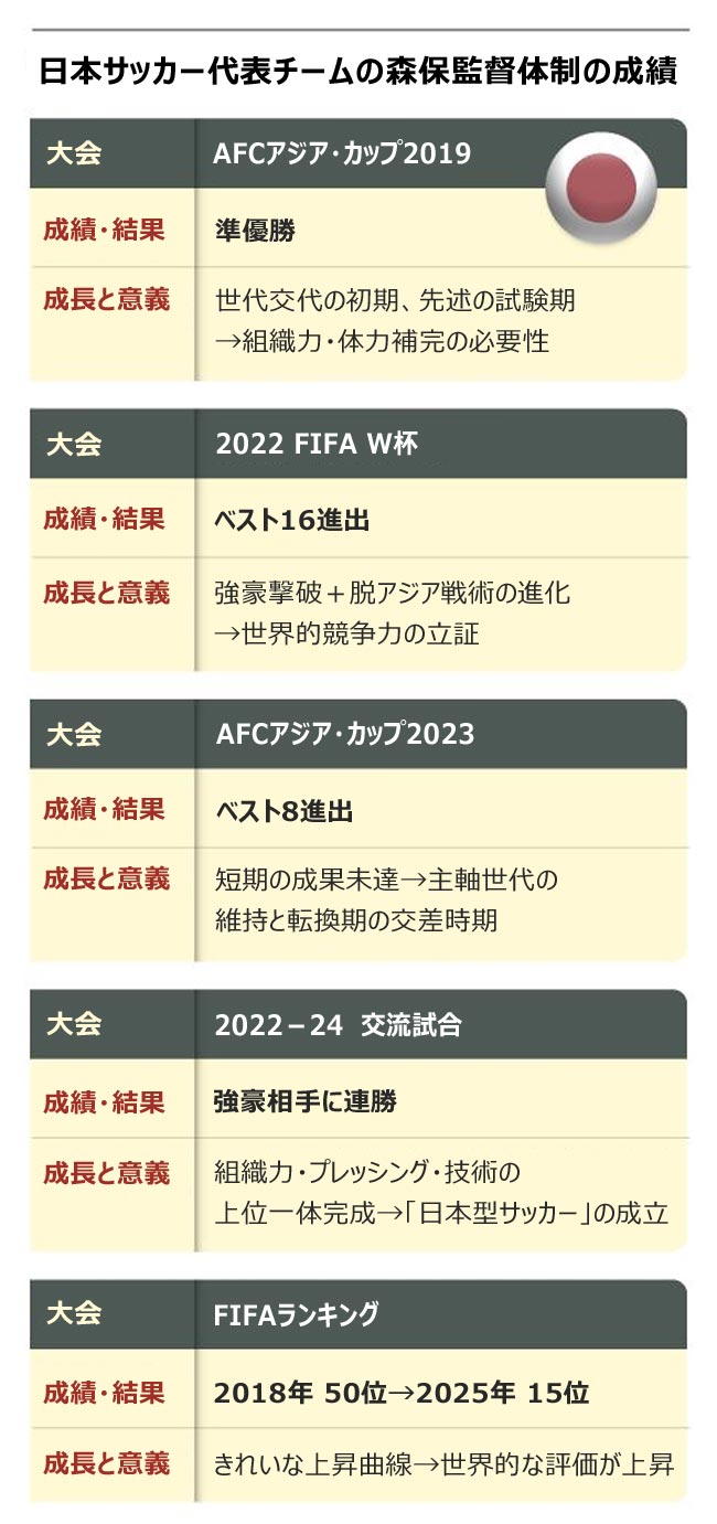 それ以降、日本代表チームは強くなった。日本サッカー協会(JFA)は森保一監督を留任させ、長所を引き継ぐとともに、敗戦の原因を徹底的に分析した。「ボールをキープしながらもチャンスの質」を重視する競技哲学に方向を旋回し、ビルドアップのスピードとハイプレスの強度を高めながら、ショートカウンターと有機的なプレッシングに焦点を合わせた戦術再構築を断行した。