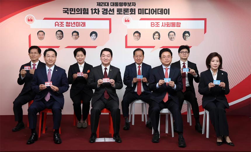 ▲ソウル汝矣島の国民の力本部で開催された第21代大統領選挙候補を選ぶ1回目の予備選討論会メディアデーに出席し、記念撮影に収まる候補者たち。17日撮影。/ニュース1