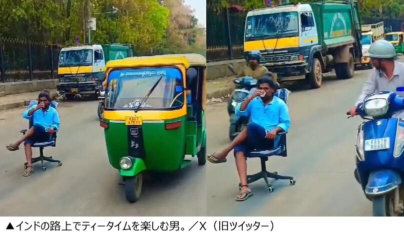 動画は12日にバンガロールの路上で撮影されたという。動画を見ると、男はキャスターの付いた事務用のいすに腰掛けて足を組み、ティータイムを楽しんでいる。バイクや車が自分の横をかすめていっても全く気にも留めない。周囲の車の運転手たちは、戸惑ったような表情を浮かべて男を見ながら通り過ぎていく。
