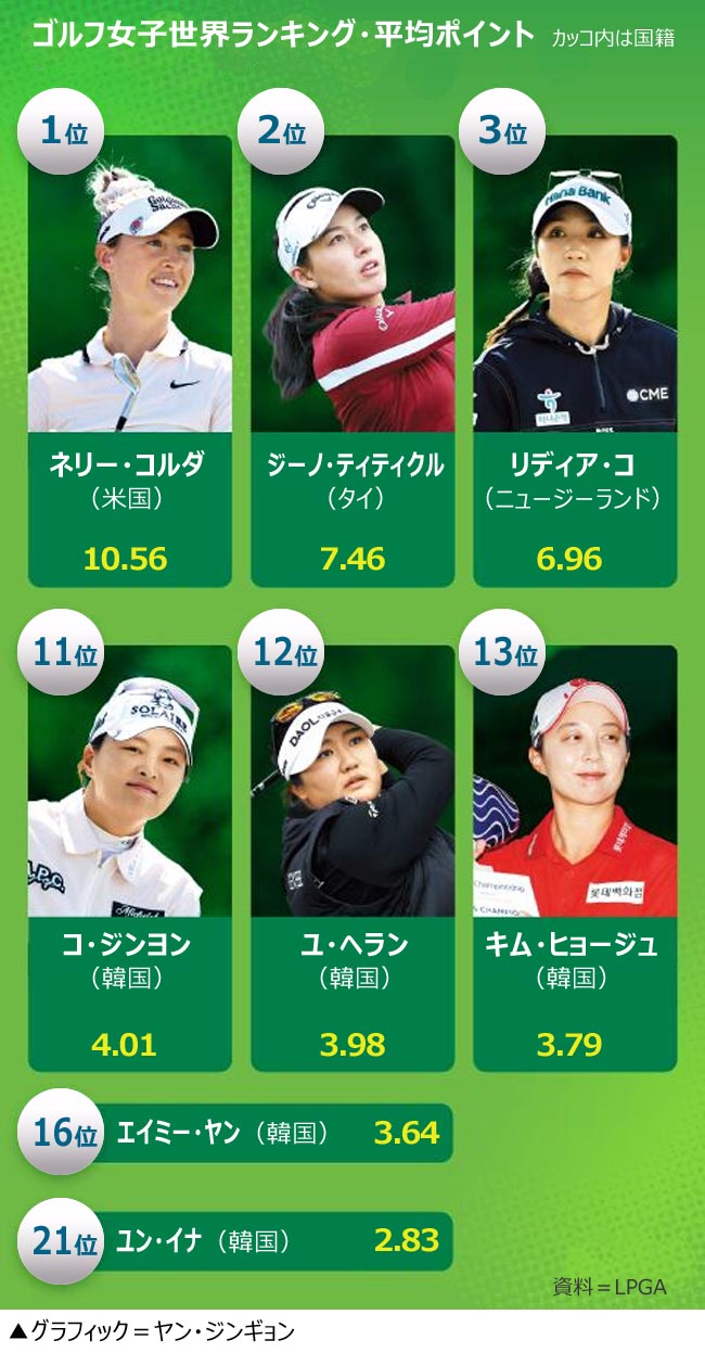 韓国の女子プロゴルファーたちが世界の舞台で活躍していたころ、米国の放送では選手の名前を呼ぶ代わりに「今週も『また別の韓国人選手(Another South Korean)』が優勝した」とよく言っていた。ほんの数年前までは、ゴルフ女子世界ランキング1位から10位までの半分以上を韓国人選手が席巻し、米女子プロゴルフ(LPGA)ツアーで2-3大会置きに韓国人選手が優勝していた時代だった。