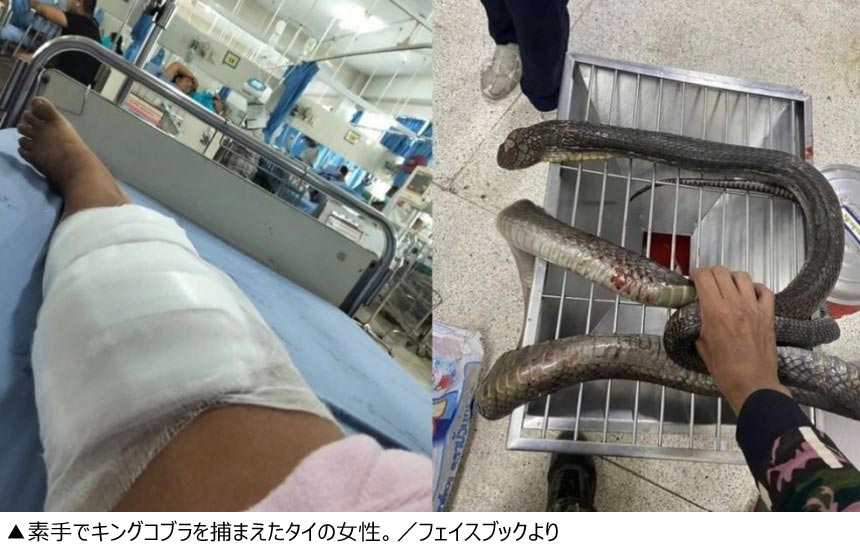 タイで40代の女性が猛毒のあるキングコブラにかまれながらも命を取りとめ、話題になっている。女性は自分を攻撃してきたヘビを素手で捕まえ、その証拠写真まで取っていた。