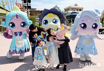 【NEWSIS】28日、ロッテワールド・アドベンチャー釜山(釜山市機張郡)を訪れた家族連れが、人気キャラクター「ティニピン」と共に記念撮影をしている様子。