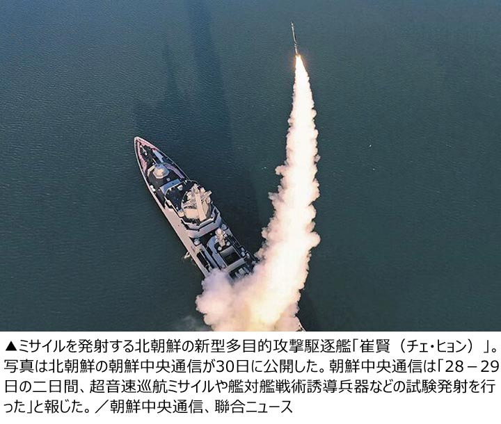 北朝鮮が今月25日に進水式を公開した新型多目的攻撃駆逐艦「崔賢(チェ・ヒョン)」で28-29日にミサイルの試験発射が行われた。艦艇の運航を始めてから3日後に武装攻撃のテストが行われたことから、崔賢の前線配備が想定以上に早まる可能性が浮上している。また北朝鮮は崔賢について「戦術核を搭載する弾道ミサイルの発射も可能」と主張しており、専門家も「北朝鮮版イージス艦と呼ばれる崔賢はロシアの技術が利用されている可能性が高い」との見方を示している。