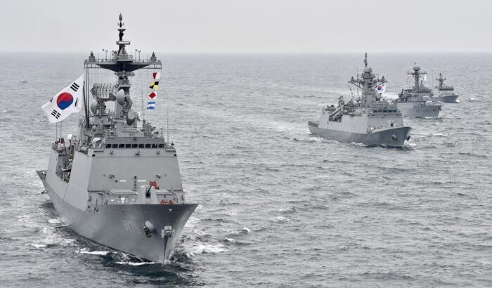 ▲2017年3月24日の第2回西海守護の日に韓国軍艦艇による大規模海上機動訓練が行われた。写真左は韓国海軍の駆逐艦「大祚栄(テ・ジョヨン)」。