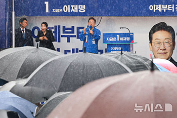 【NEWSIS】進歩(革新)系の「共に民主党」に所属する李在明(イ・ジェミョン)大統領選候補が15日、全羅南道光陽市にある全南ドラゴンズのサッカーグラウンド近くで行われた遊説で支持を訴え、支持者らは雨の中で傘を差して遊説を聞いた。