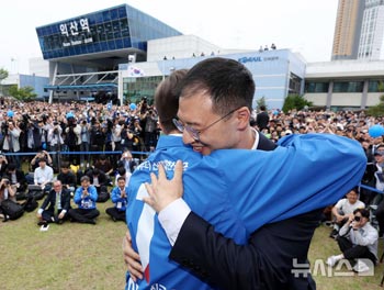 【NEWSIS】進歩(革新)系の「共に民主党」に所属する李在明(イ・ジェミョン)大統領選候補が16日、全羅北道益山市の益山駅東部広場で開かれた遊説で、保守系の旧与党「国民の力」を利用して無所属になった金相旭(キム・サンウク)議員と抱擁している様子。金相旭議員は国民の力を利用して李在明候補支持を宣言した。