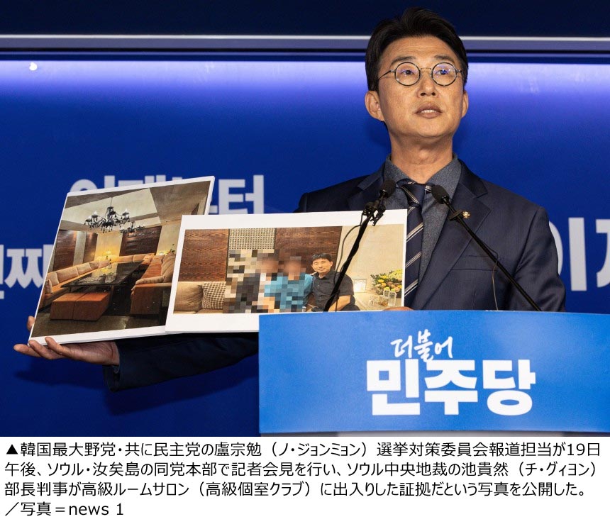 韓国最大野党・共に民主党は19日、「尹錫悦(ユン・ソンニョル)前大統領の内乱首謀罪を巡る裁判で裁判長を務めている池貴然(チ・グィヨン)判事が高級ルームサロン(高級個室クラブ)で接待を受けていた」という同党の疑惑提起を裏付ける根拠だとして、写真を数枚公開した。飲食店内部の写真は共に民主党が店で撮ったもので、池貴然判事が男性2人と一緒に写っている写真もあった。共に民主党は同席者たちについて「法曹関係者ならば職務との関連性が認められる」と言った。