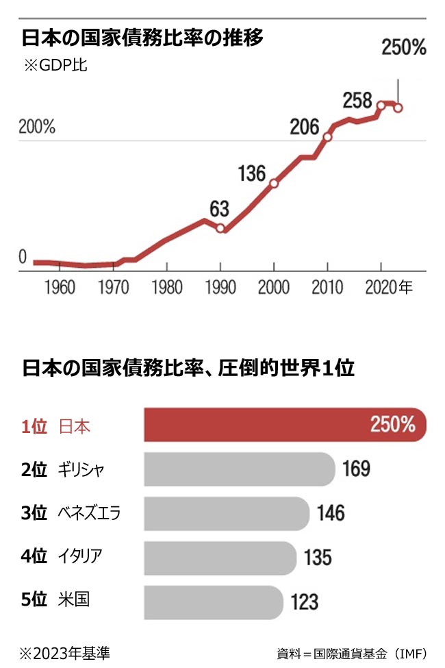 日本の政界では減税の財源として国債発行を主張する声もあるが、石破茂首相は反対の姿勢を示している。石破首相は19日の参院予算委員会で「わが国の財政状況は極めてよくない。ギリシャよりも悪い」と述べた。国際通貨基金(IMF)の集計によると、日本は2023年末現在で国内総生産(GDP)に対する政府債務の比率(政府債務残高対GDP比)が249.7%で世界1位を独走している。2位のギリシャ(債務比率168.9%)を大きく引き離しているのだ。