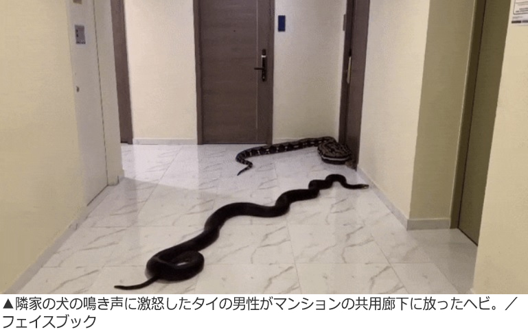 ペットの飼育が禁止されているタイのマンションで、隣の部屋でうるさい犬を飼っているとして管理事務所に苦情を入れた男性が、「適切な対応が取られなかった」として、マンションの共用廊下に巨大なヘビ2匹を放っていたことが分かった。