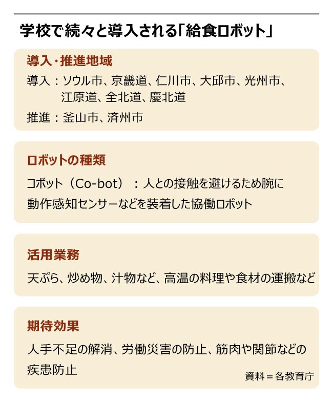 これは何も大田市に限ったことではなく、学校給食の調理師が「勤労環境の改善」を求めてストライキに踏み切る事態は、全国各地で発生している。実際、給食の調理師は厳しい労働環境に対して賃金が低く、人手不足が続いている。主な市・道の教育庁では、換気施設の拡充など労働環境を改善するとともに、人手不足やストライキで生じた人材の空白を埋めるため、大量の給食を手掛けることのできるロボットの導入を急ピッチで進めている。