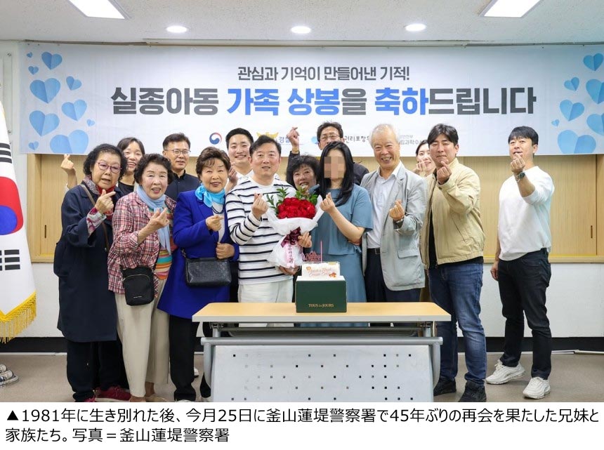 釜山蓮堤警察署は「ソウル在住の妹Aさん(48)と釜山在住の兄Bさん(51)が45年ぶりに今月25日、再会した」と発表した。