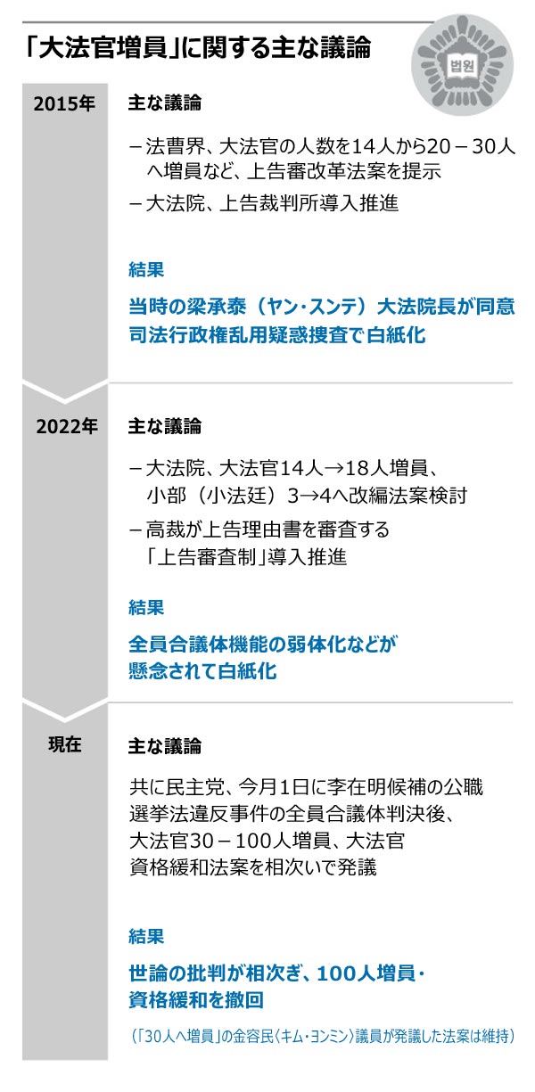 また、国会法制司法委員会は14日、大法官の定員を100人(張京泰議員案)に増やす裁判所組織法改正案を共に民主党主導で第1小委員会に回付していた。