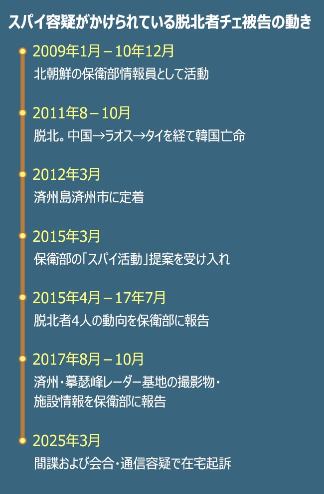 チェ被告の不審な行動は結局、警察と検察に尻尾をつかまれた。済州地検刑事2部(崔鏞普〈チェ・ヨンボ〉部長検事)は、チェ被告を国家保安法違反(間諜〈かんちょう〉および会合・通信)容疑で在宅起訴した。検察関係者は「被告は北に残してきた家族やお金が理由で犯行に及んだものとみているが、余罪があるかどうか、さらに捜査を進めている」と語った。なお検察は、被告は当初から脱北者を装って保衛部が潜入させたスパイなのではないか、という点も確認中だという。