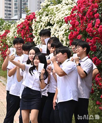 【NEWSIS】第21代韓国大統領選挙の期日前投票初日に当たる29日、京畿道水原市の鍊武洞行政福祉センターに開設された期日前投票所で三一工業高校3年生の有権者らが、生涯初の投票を終えて記念撮影をしているところ。