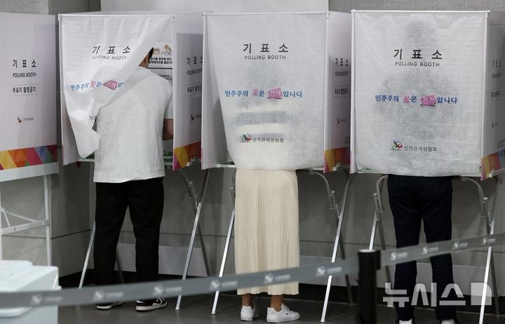 ▲第21代韓国大統領選挙の期日前投票が行われた30日、釜山蓮堤区庁に設置された期日前投票所で貴重な一票を行使する市民。